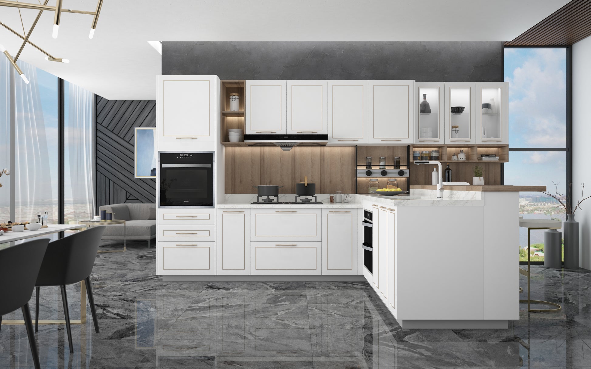 GoldenHome offers a variety of cabinet door panel options, including integrated panels, lacquer, thermofoil, and solid wood.